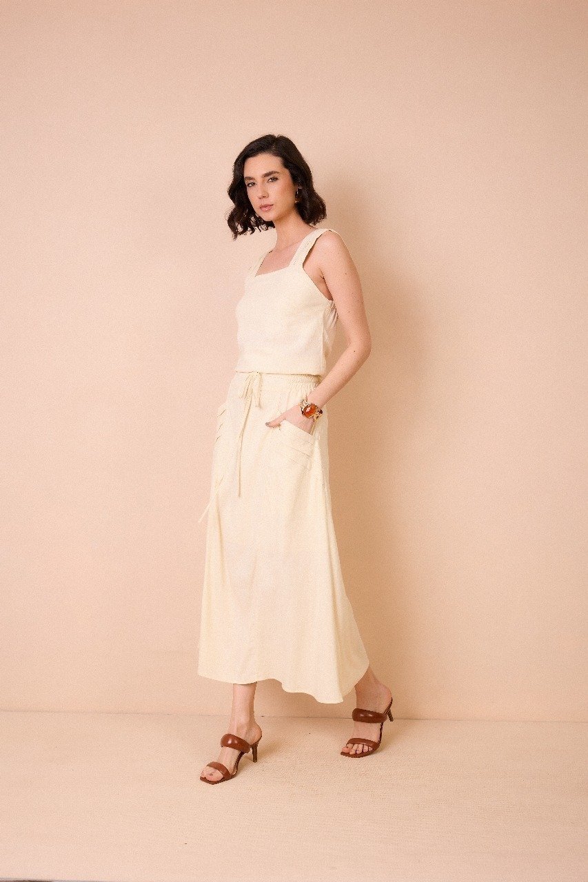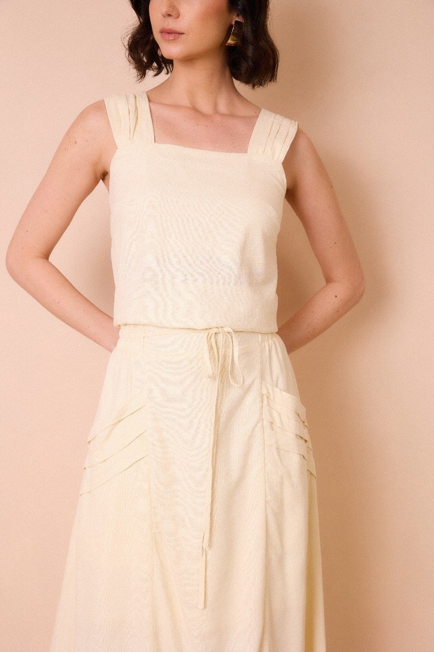 Conjunto confeccionado em tecido de algodão com linho, que combina conforto, frescor e elegância natural. A blusa possui decote quadrado, alças largas com delicado efeito drapeado e acabamento clean. A saia longa tem cintura com elástico e amarração ajustável, além de bolsos funcionais com detalhe de pregas que trazem charme artesanal à composição. Um conjunto leve e sofisticado, perfeito para produções casuais e elegantes nos dias mais quentes. Composição: 70% Algodão + 30% Linho