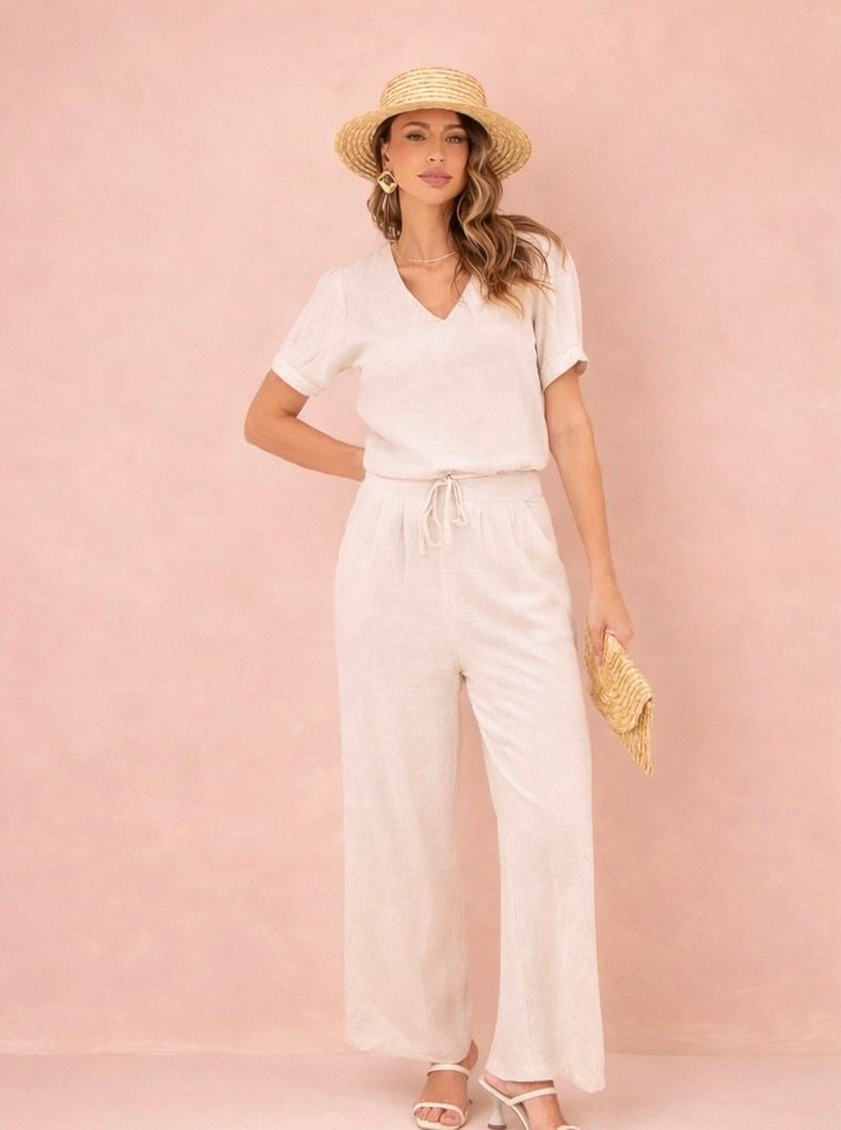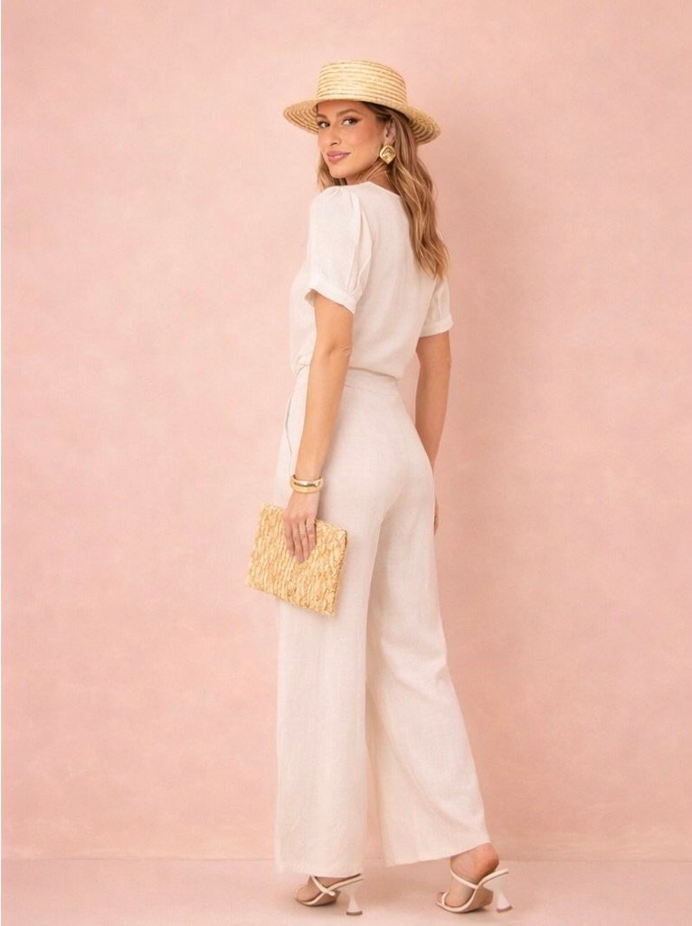 Este conjunto de blusa e calça pantalona feminina é a definição do equilíbrio entre elegância e casualidade. Fabricado em linho com viscose de alta qualidade, o conjunto oferece conforto, sofisticação e um toque suave ao mesmo tempo. Composição: 70% viscose 30% linho