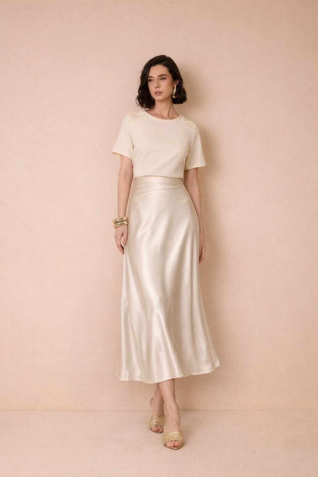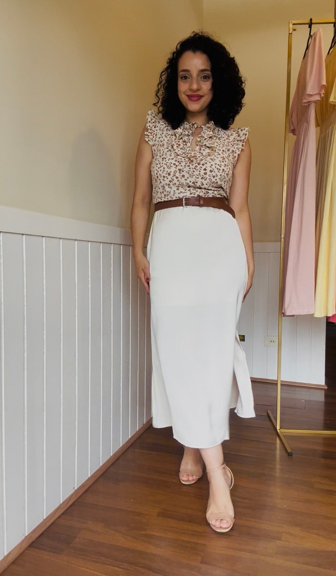 A Saia Elise é confeccionada em cetim, trazendo brilho suave, toque sedoso e um caimento elegante que valoriza cada movimento. Sofisticada e versátil, é a peça ideal para compor looks modernos e femininos, do casual chic às ocasiões especiais.